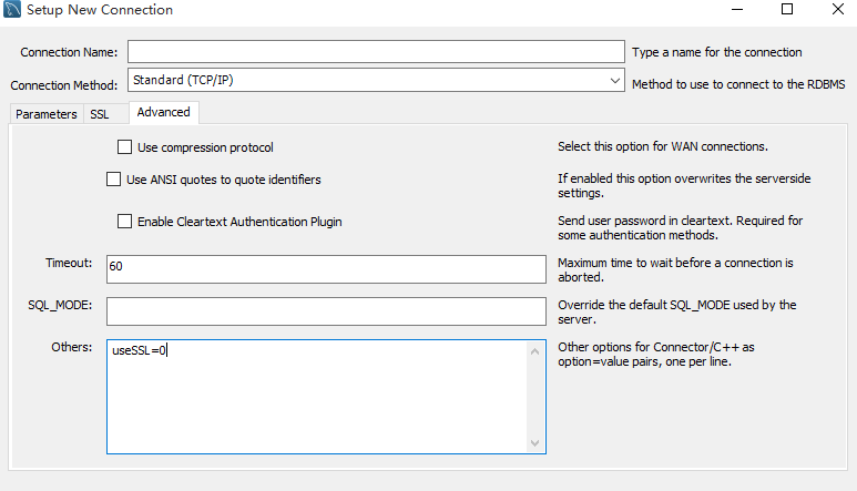 解決方案一:不使用SSL,在Advance TAB頁(yè)的others框中輸入?yún)?shù):useSSL=0,就可以連接上了。